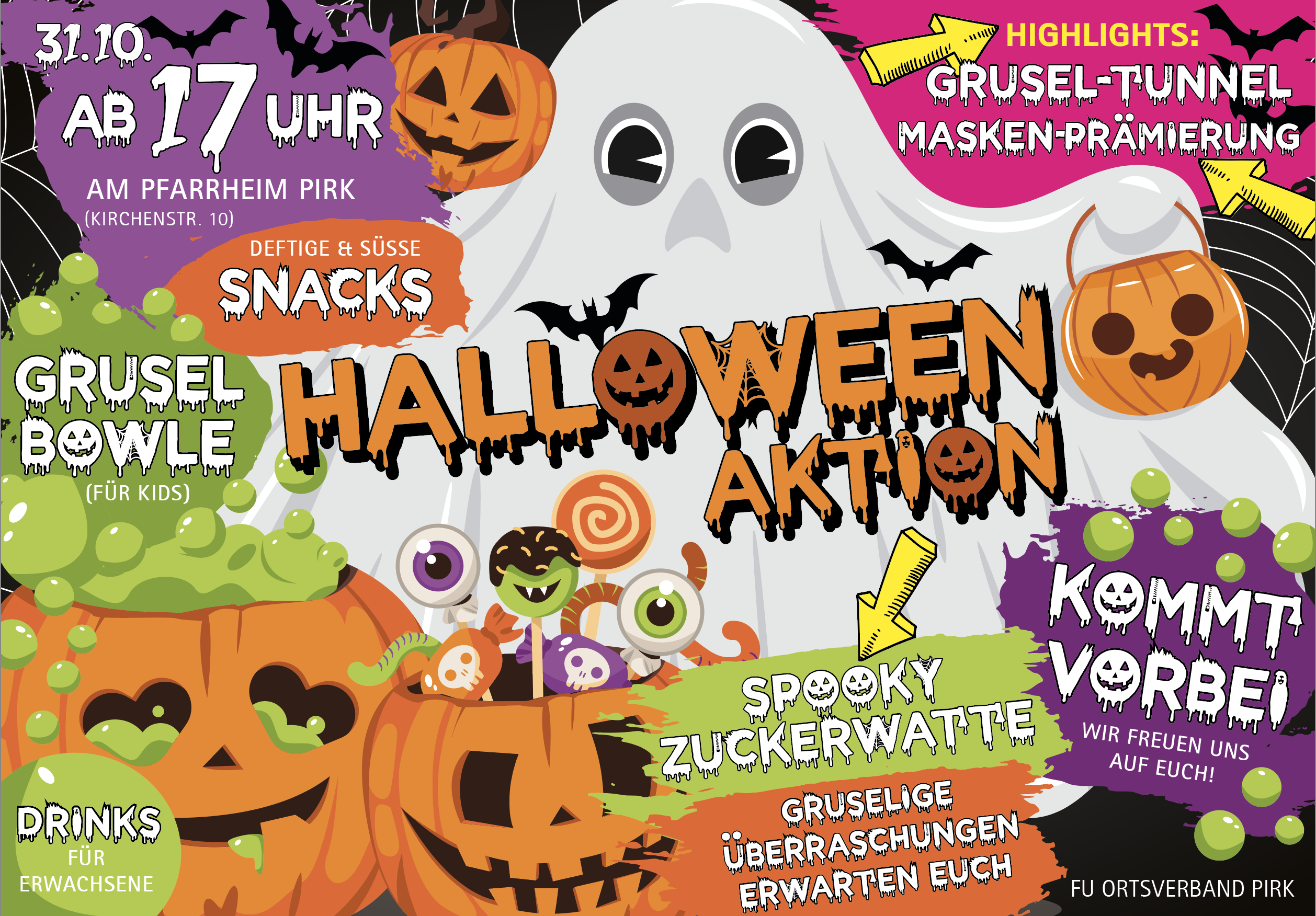 Halloween-Aktion der Frauenunion Pirk im Garten des Pfarrheims. Für Essen und Getränke ist gesorgt! Gruselige Überraschungen und viele Halloween-Specials! Näheres siehe Flyer!